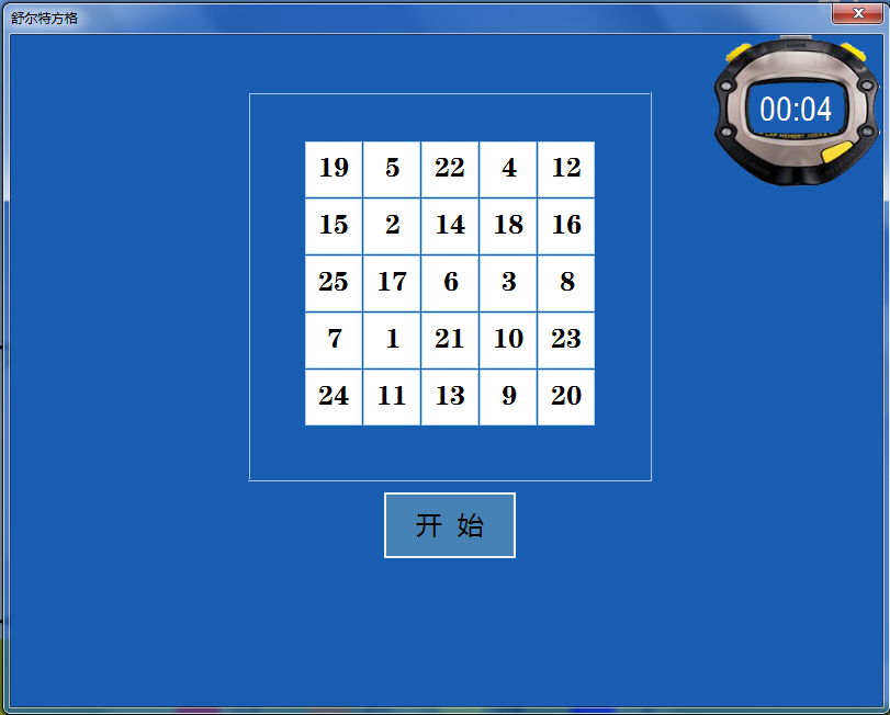 舒爾特方格也叫舒爾特表格,也叫蘇爾特方格、蘇爾特表格。 舒爾特方格用于訓(xùn)練注意力,是世界上最專業(yè)最普及最簡(jiǎn)單的訓(xùn)練法,廣泛應(yīng)用于飛行員航天員的訓(xùn)練。適用于各個(gè)年齡段的人群,對(duì)少年兒童提高注意力有特別大的幫助。小朋友注意力水平提高了,學(xué)習(xí)成績(jī)